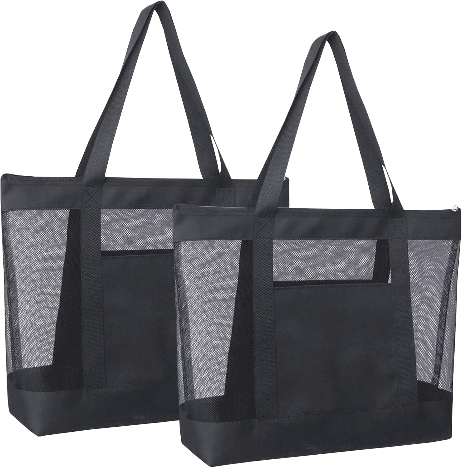 2Pack Lightweight Mesh Tote Bag,Sandproof Beach Bags with Zipper &Double Pocket For Groceries,Poolside,Travel,Towels