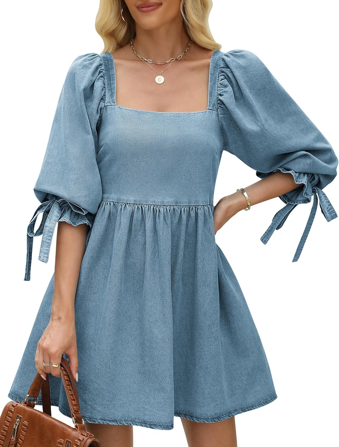 Denim Dress for Women Square Neck Jean Dress Puff Sleeve Babydoll Casual Denim Romper Outfit with Pockets