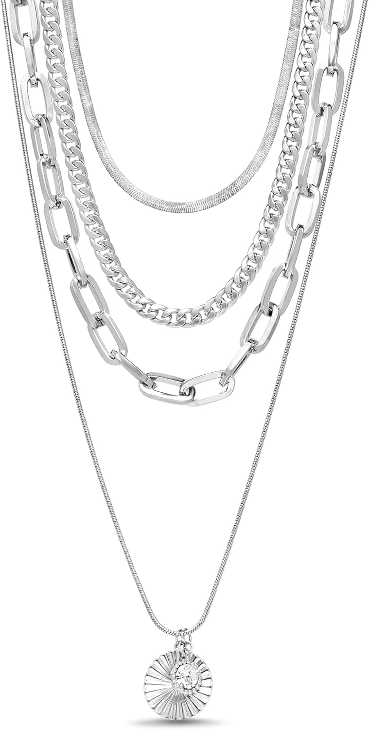 Nautica Rhinestone Disc Pendant Layered Necklace for Women Rhodium Plated Alloy Four Row White Chain 14 - 22 Inches