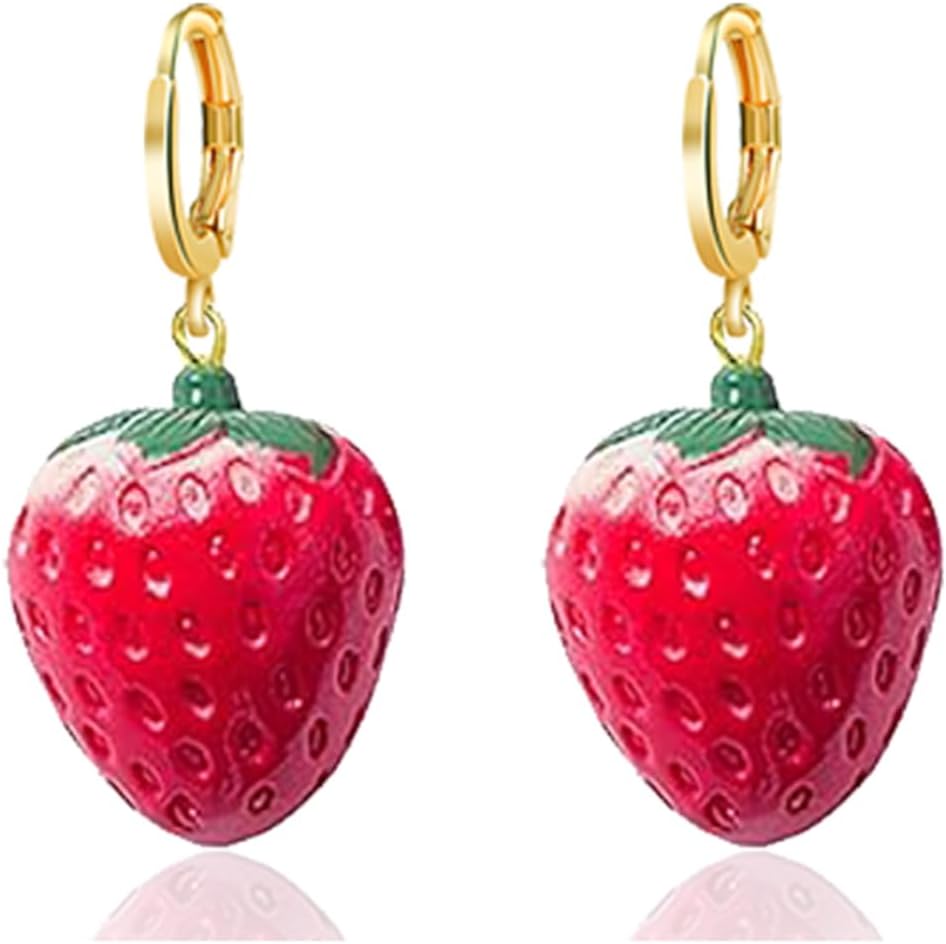 Dreuyet Sweet Strawberry Earrings for Women Creative 3D Simulated Fruit Hoop Earrings Funny Lifelike Red Strawberry Drop Dangle Earring Summer Jewelry