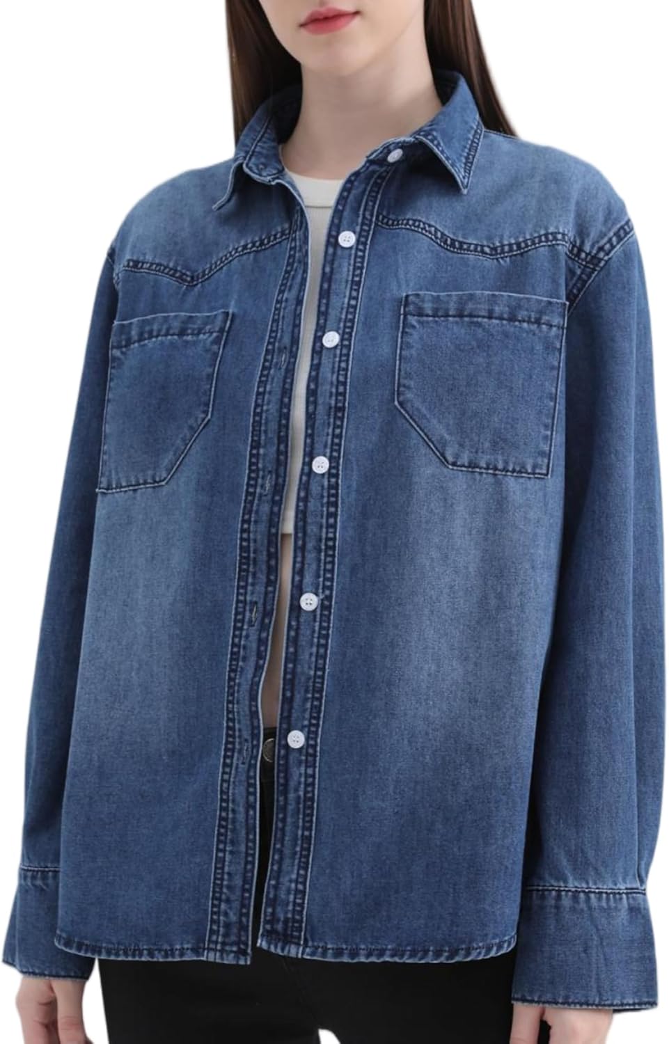 Women's Denim Button Down Shirts Oversized Long Sleeve Double Pocket Jean Shirt