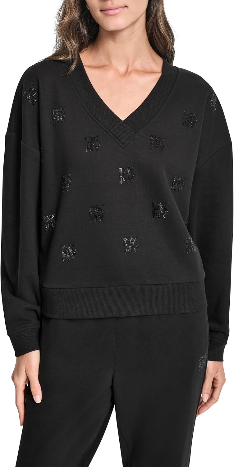 DKNY womens All Over Rhinestone V-neck Logo Fleece Sweatshirt