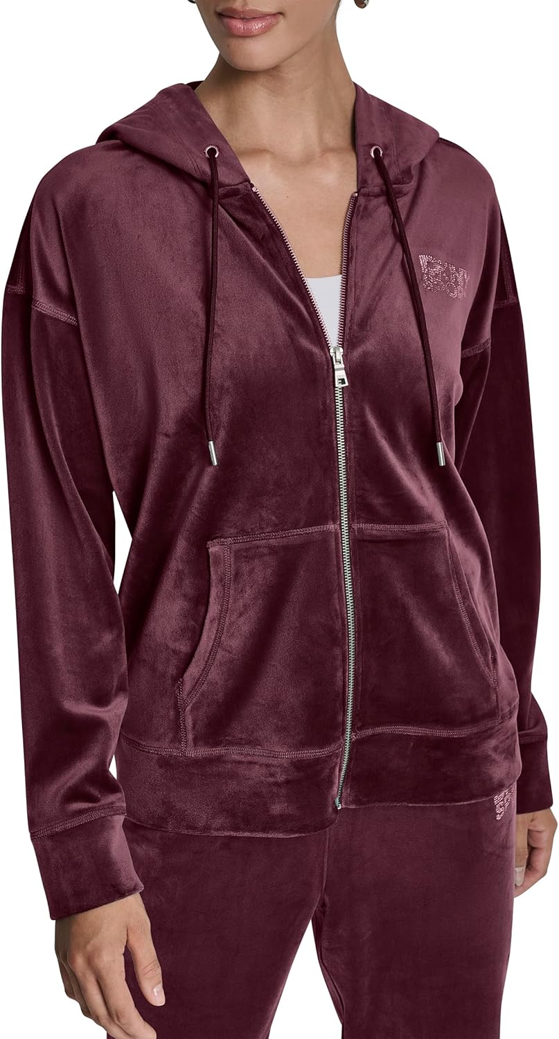 DKNY womens Full Zip Rhinestone Logo Novelty Velour Hoodie Sweatshirt