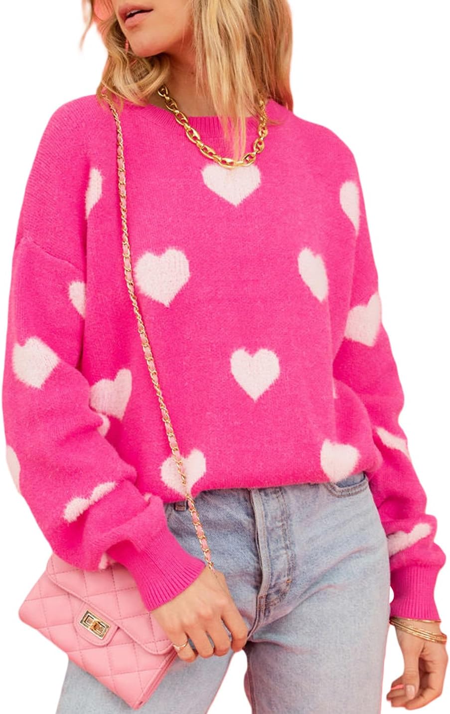 Cute Pink Heart Sweater for Women Knitted Love Sweaters Tops Holiday Outfits Crewneck Long Sleeve Pullover Shirts