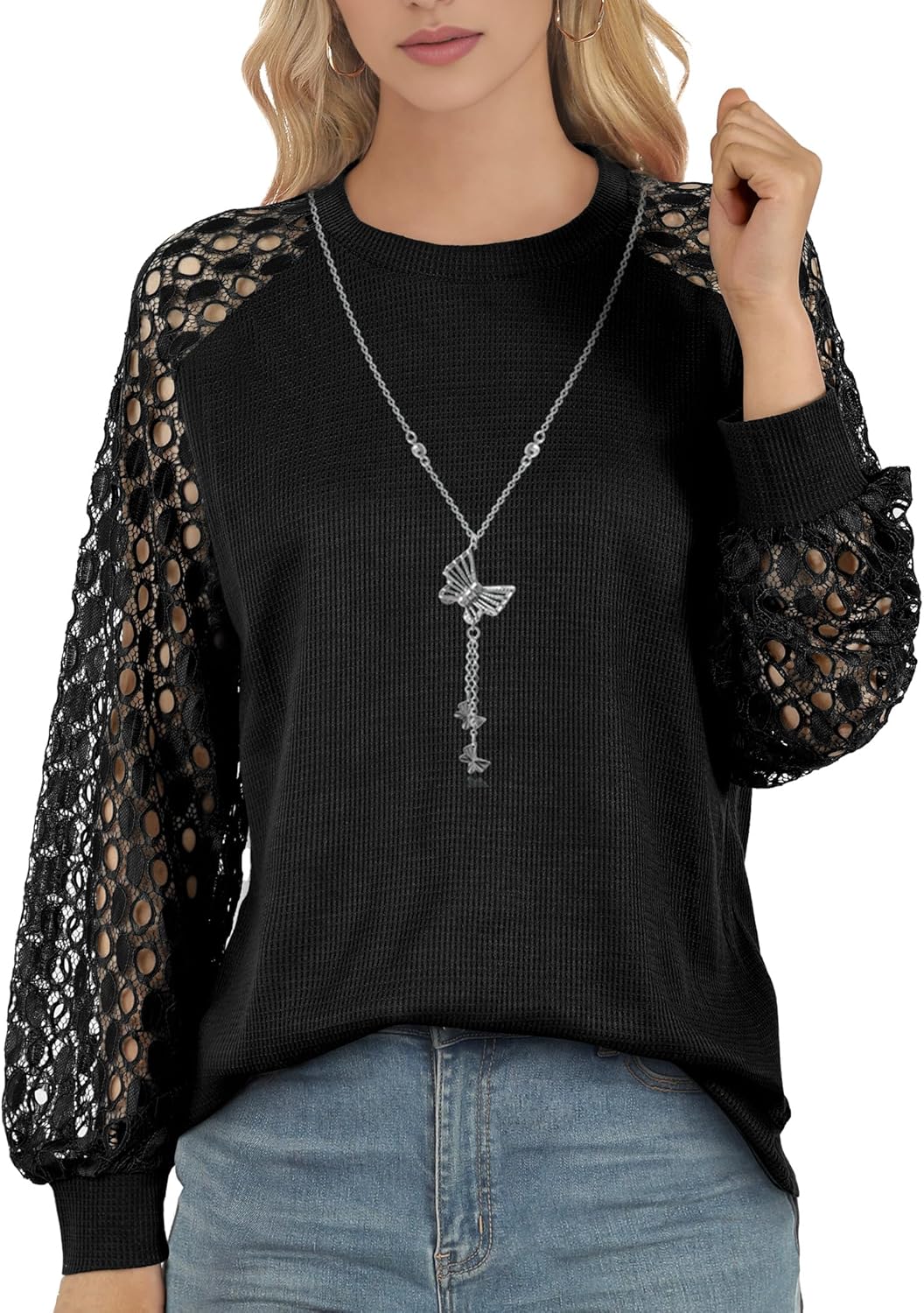 AURUZA Long Sleeve Shirts for Women Waffle Knit Puff Lace Sleeve Tops Dressy Casual Blouses Work Business Fall Outfits
