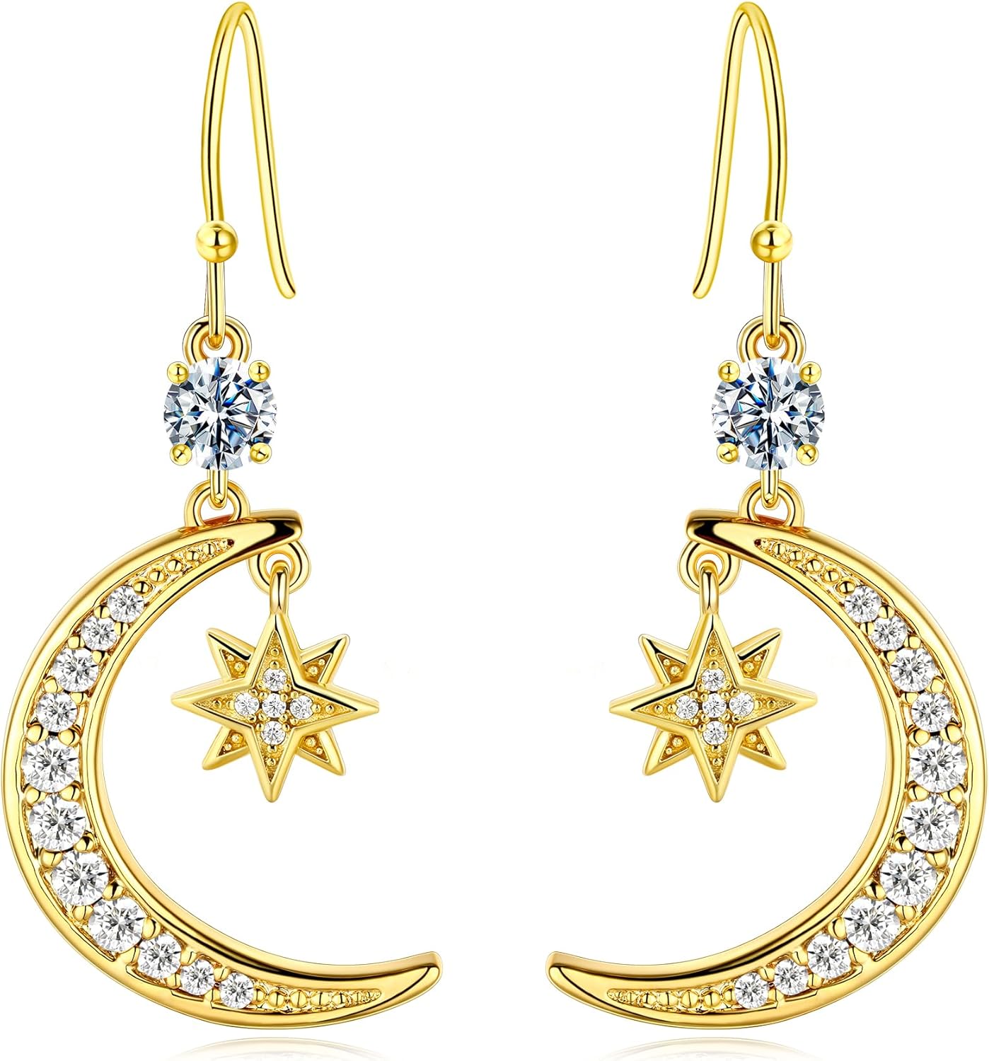 Moon and Star Pendant Drop Earring for Women, Dainty Trendy Gold Plated Cubic Zirconia Dangle Eearrings Jewelry Gift