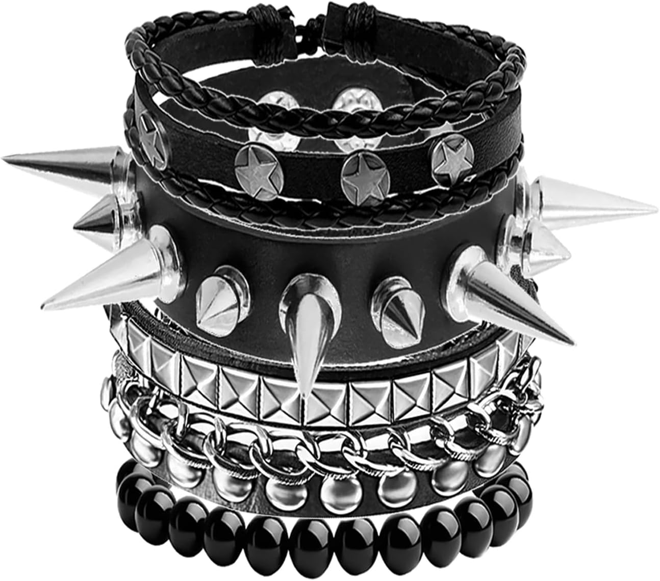 BATHRINS 4 Pcs Punk Rock Studded Bracelets for Men Women 80s Gothic Spike Leather Cuff Bracelet Set Emo Accessories