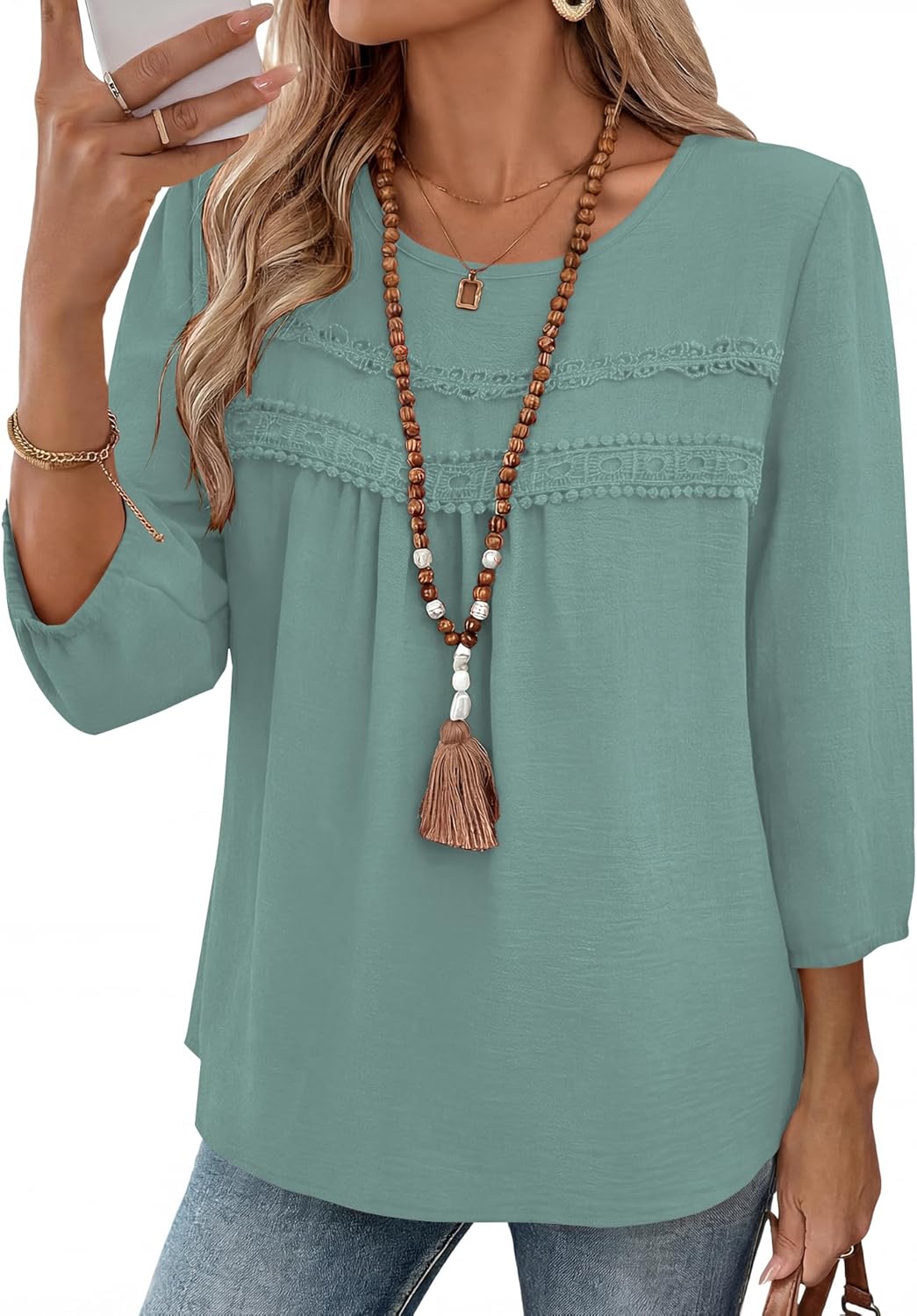 Ivicoer 3/4 Length Sleeve Womens Tops Crewneck Dressy Casual Chiffon Blouses Flowy Lace Boho Clothing Trendy 2026