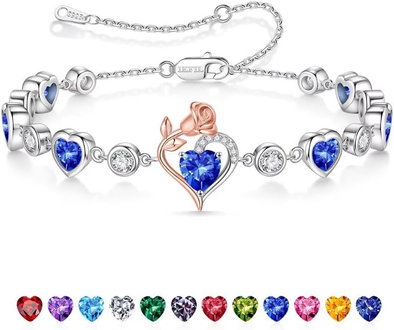 Iefil Birthstone Bracelets for Women - 925 Sterling Silver Rose Heart Charm Bracelets, Anniversary Birthday Gifts for Women Wife Mom Girlfriend Daughter, 6"+2"