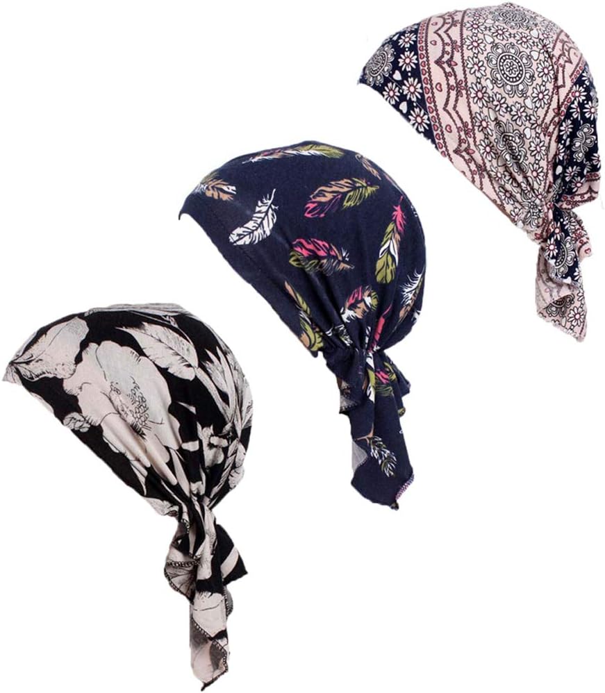 Pre Tied Chemo Head Scarf 3 Packed Beanie Skull Cover Cap for Women (Set6-Long Style)