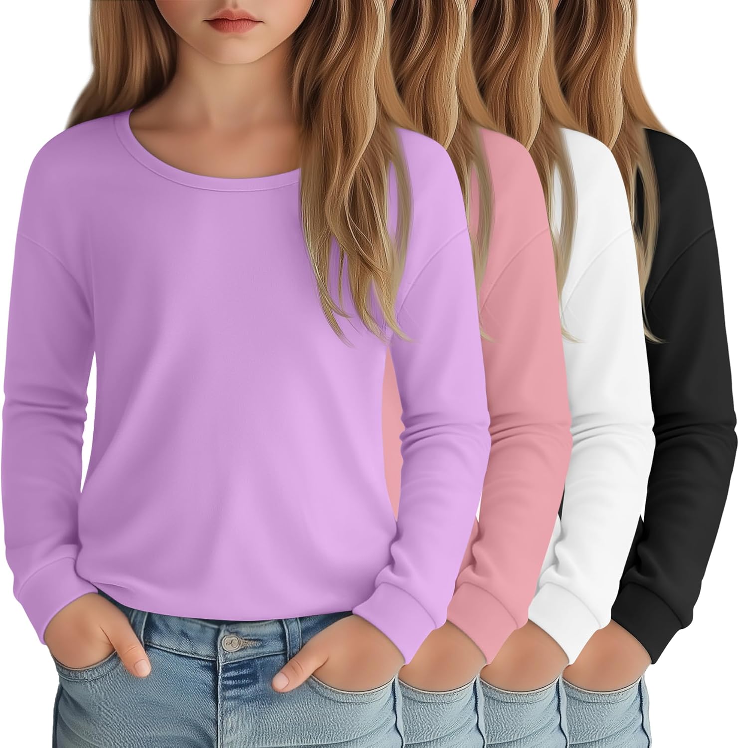 4 Pack Girls Long Sleeve Shirts Kids Loose Round Neck Casual Toddler Basic Tops Soft Cute Tween Youth Tee