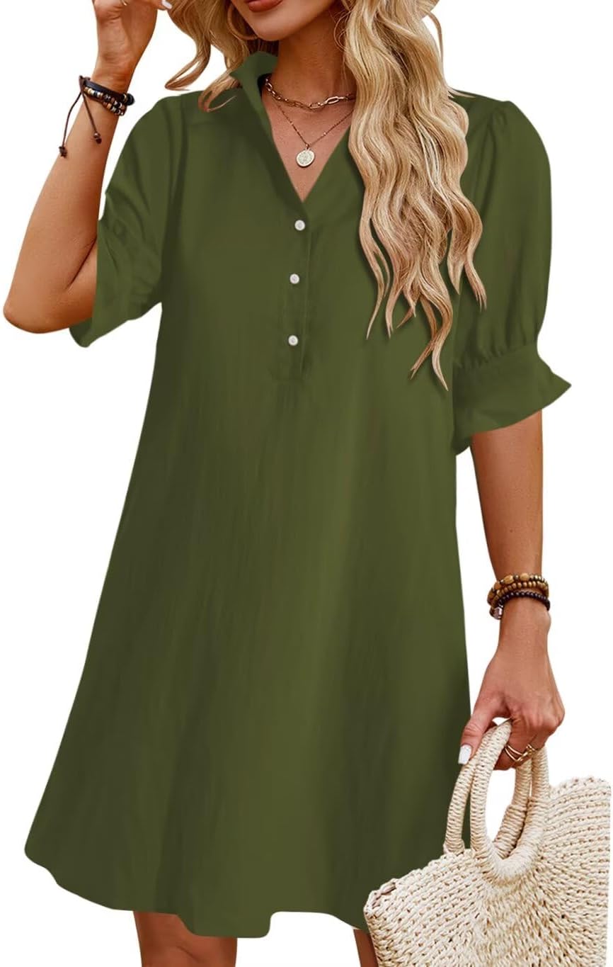 Womens Summer Shirt Dress 2026 Casual Ruffle Short Sleeve Button Down Flowy Swing Shift Mini Dresses with Pockets