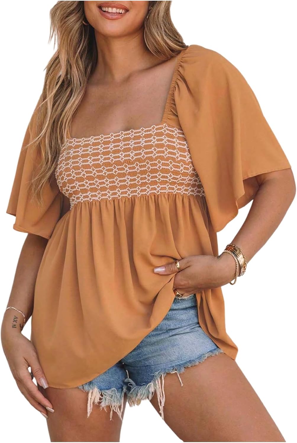 MakeMeChic Women's Shirred Square Neck Babydoll Shirt Tie Backless Half Sleeve Blouse Peplum Top