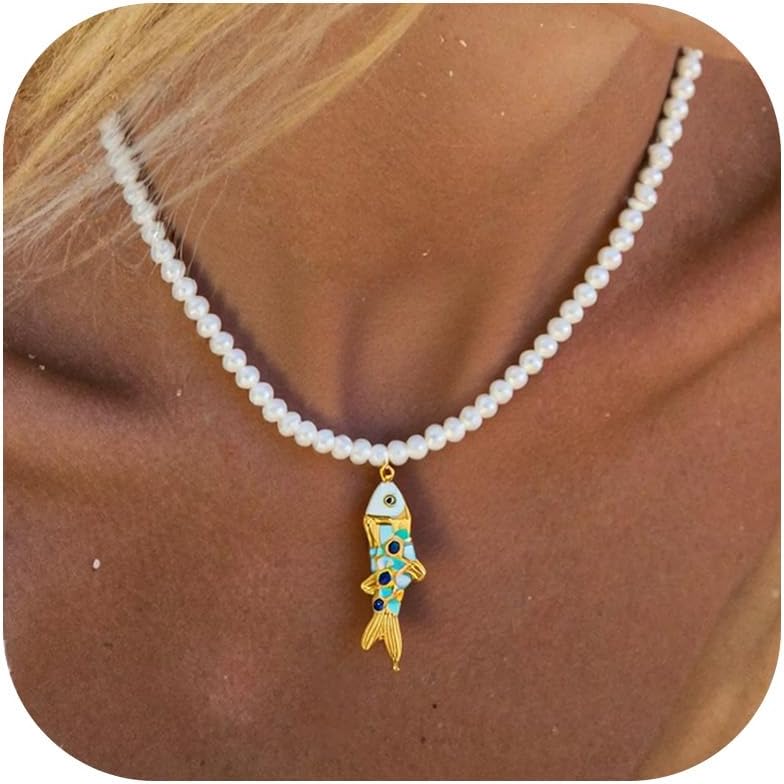 Aonklot Colorful Fish Charm Necklace Pearl Choker Necklaces for Women Cute Fish Jewelry Beach Charm Necklace