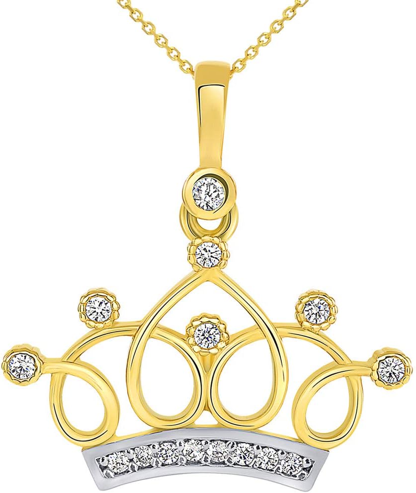 14k Yellow Gold Cubic Zirconia Studded Elegant Princess Crown Pendant Necklace
