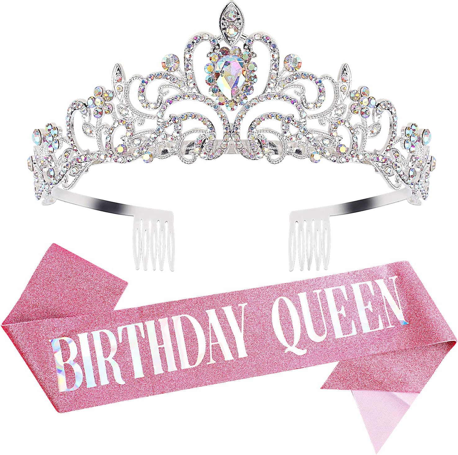 Velscrun Birthday Queen Tiaras Crown for Women, Queen Tiara for Mom, Girls Princess Crowns for Women, AB Rhinestones Birth Crown Headband Birth Sash, 50th Birthday Prom Party Decorations