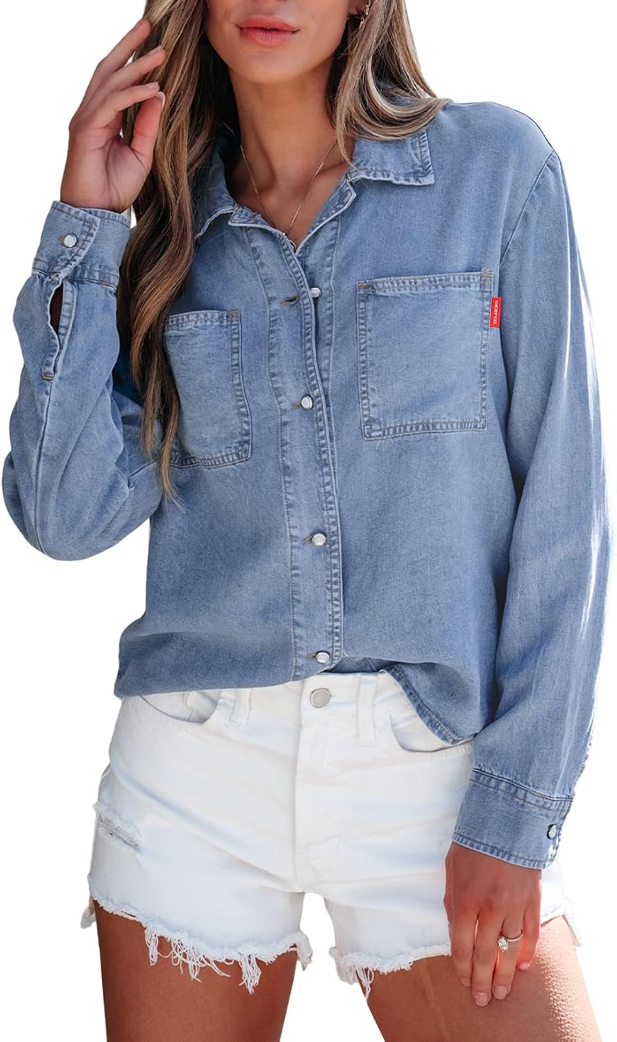 Sidefeel Women's Denim Shirts Button Down Jean Shacket Spring Outfit 2025 Long Sleeve Chambray Blouse Top