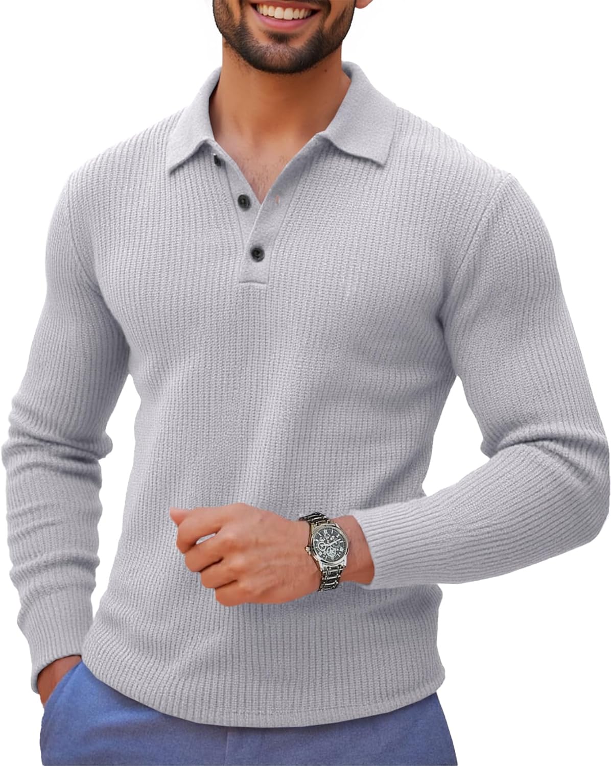 Runcati Mens Long Sleeve Polo Sweater Knit Polos V Neck Casual Dress Button Collared Pullover Sweaters