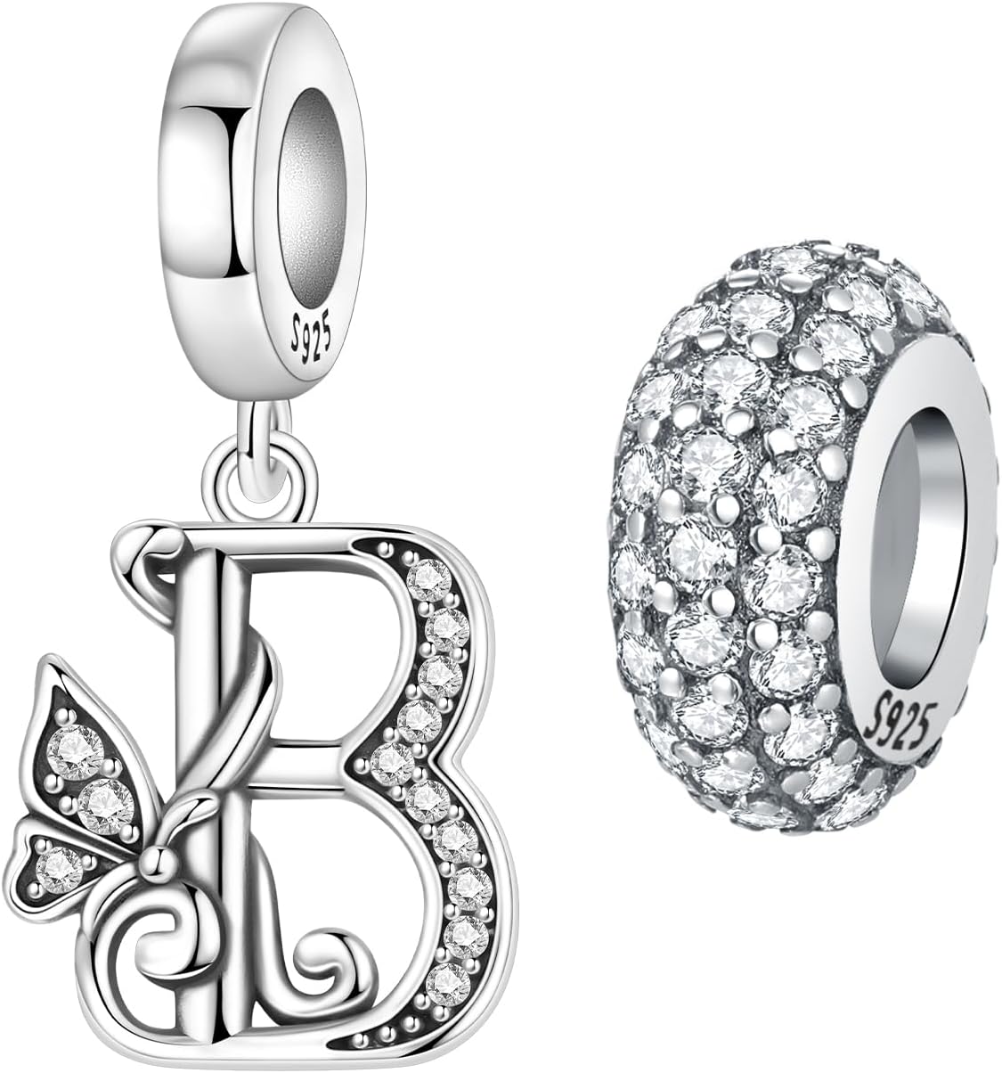 2 Pack 925 Sterling Silver Butterfly Letter Charms for Bracelets and Necklace Alphabet Initial Dangle Pendants Round Spacer Beads Pave Cubic Zirconia Jewelry Gift for Women