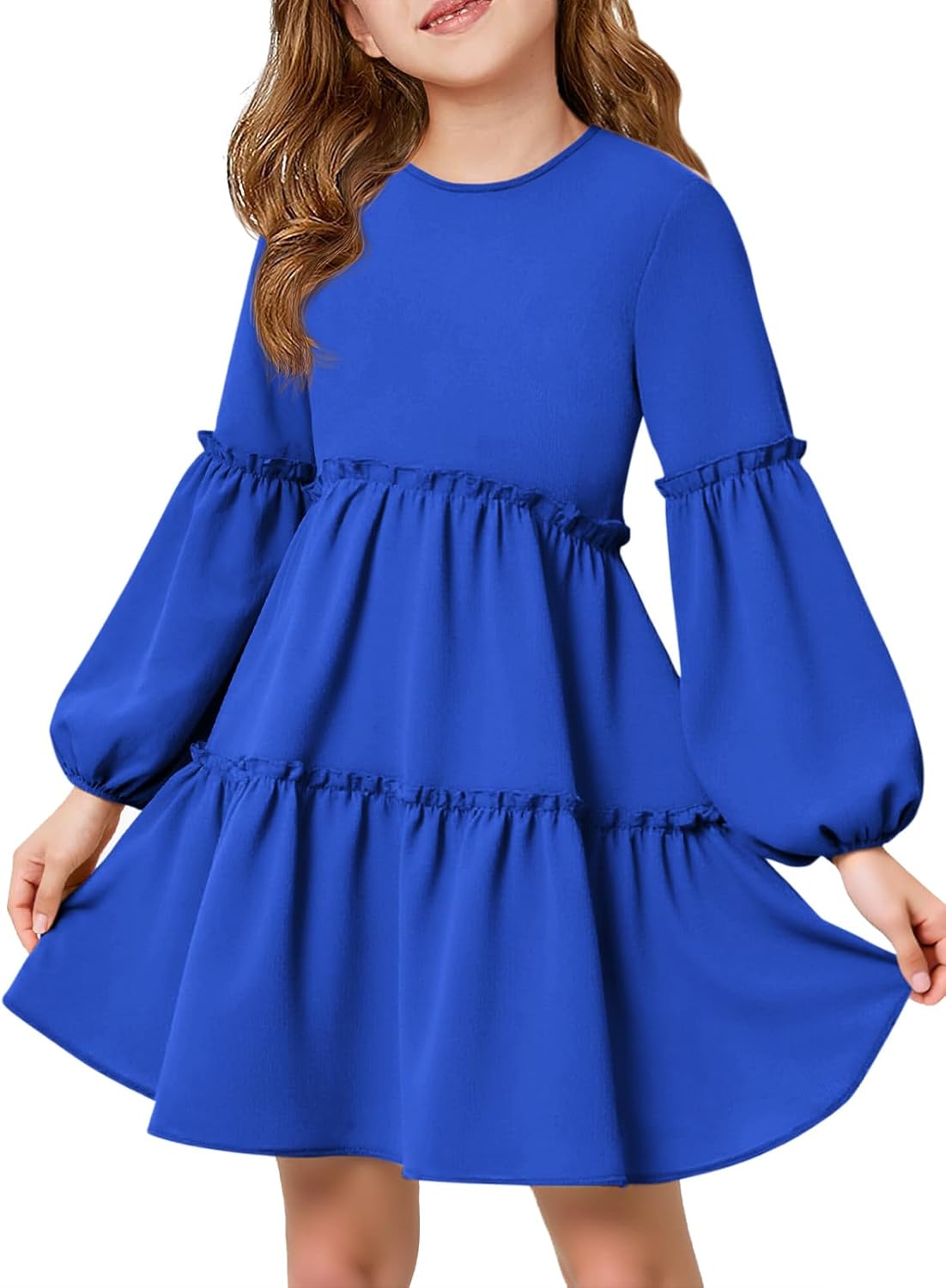 Girls Lantern Long Sleeve Dress Kids Flowy Tiered Ruffle Crewneck A-Line Fall Dresses 5-14 Years