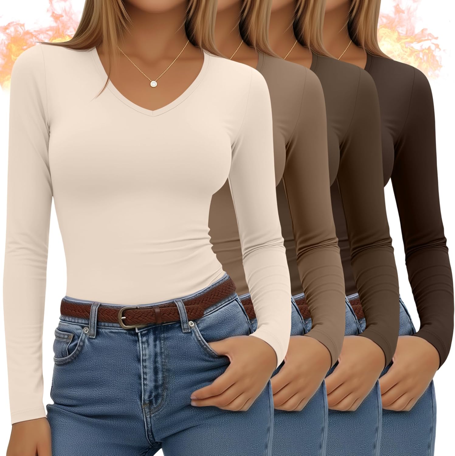 4 Pack Women's Long Sleeve Thermal Shirts Fleece Lined V Neck Slim Fit Underwear Base Layer Basic Winter Warm Tops