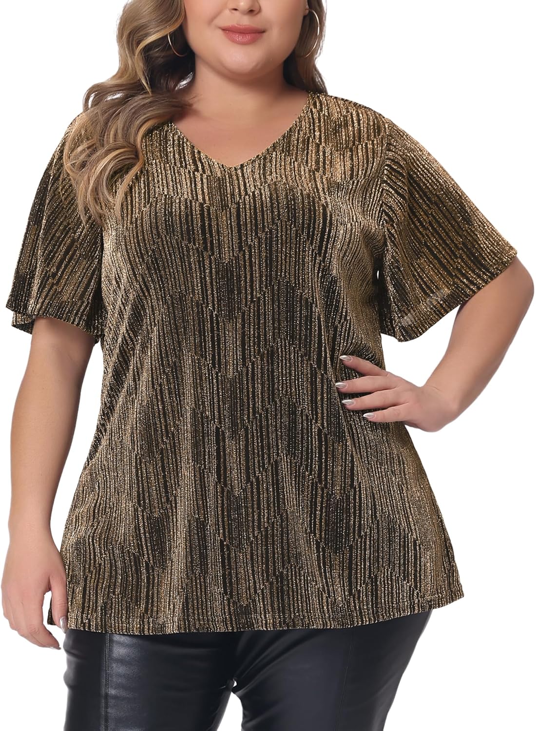 Agnes Orinda Plus Size Metallic Tops for Women V Neck Short Sleeve T-Shirt Party Top Glitter Blouses