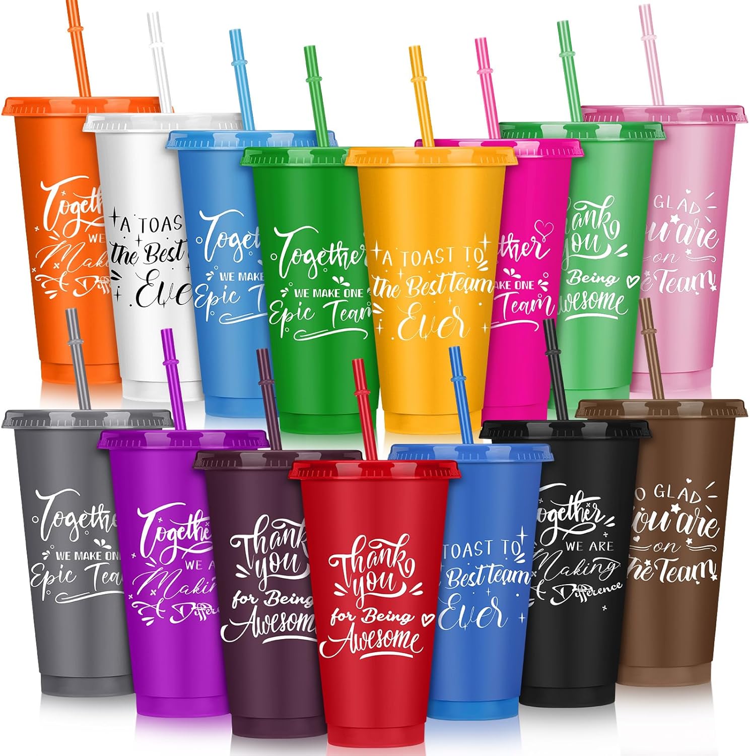 Mifoci Bulk Employee Appreciation Gifts 24oz Plastic Cups Tumblers with Straw Lid Staff Team Teacher Appreciation Gifts Reusable Inspirational Cups for Coworker Employees Volunteer(Multicolor,15 Pcs)