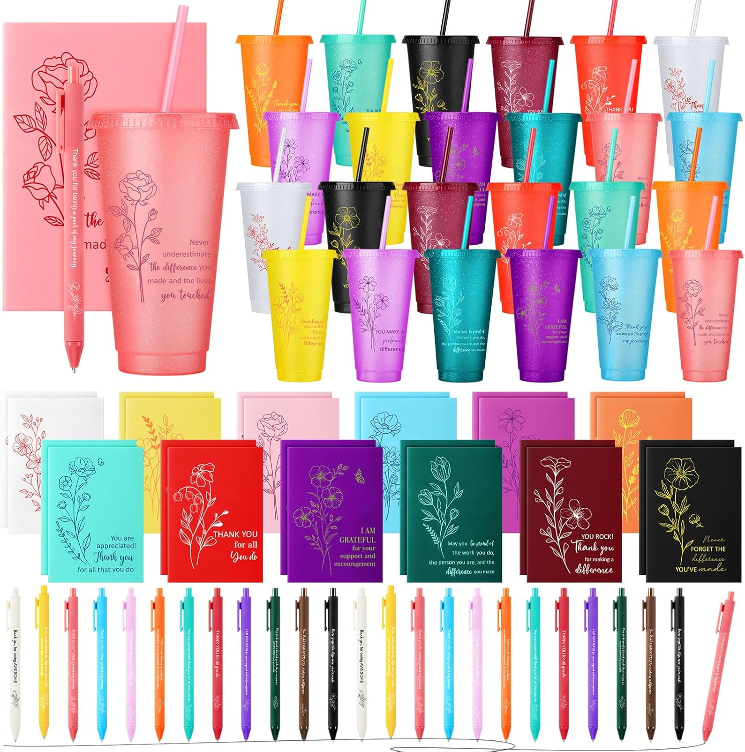 - Portable Travel Size: the inspirational notepads have dimensions of 4 x 5.5 inches and the ballpoint pens measure 5.5 inches in length; The capacity of the reusable cups with lids and straws is 24 oz; This thank you gift set is designed to be easily portable, allowing you to carry it conveniently at parties or travel to enjoy your drinks and capture your inspiration and jot down your thoughts at any time