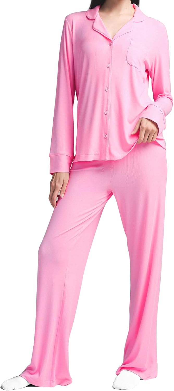 Womens Pajama Sets 2 Piece Button Down Long Sleeve Soft Knitted Sleepwear Pjs Lounge Sets Nightwear