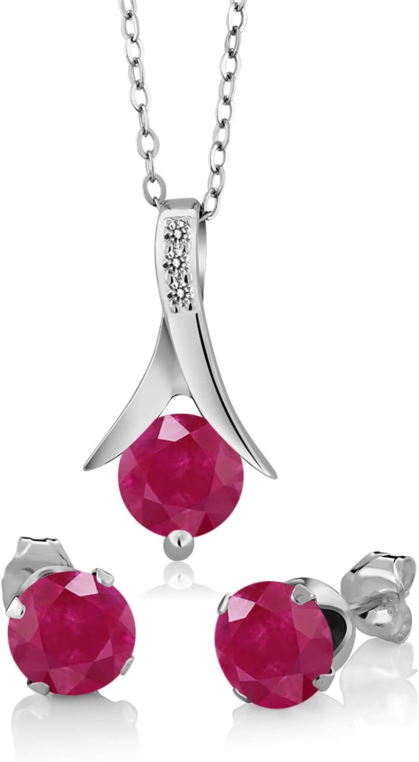 Gem Stone King 3.05 Ct Round Red Ruby White Diamond 925 Sterling Silver Pendant and Earrings Jewelry Set