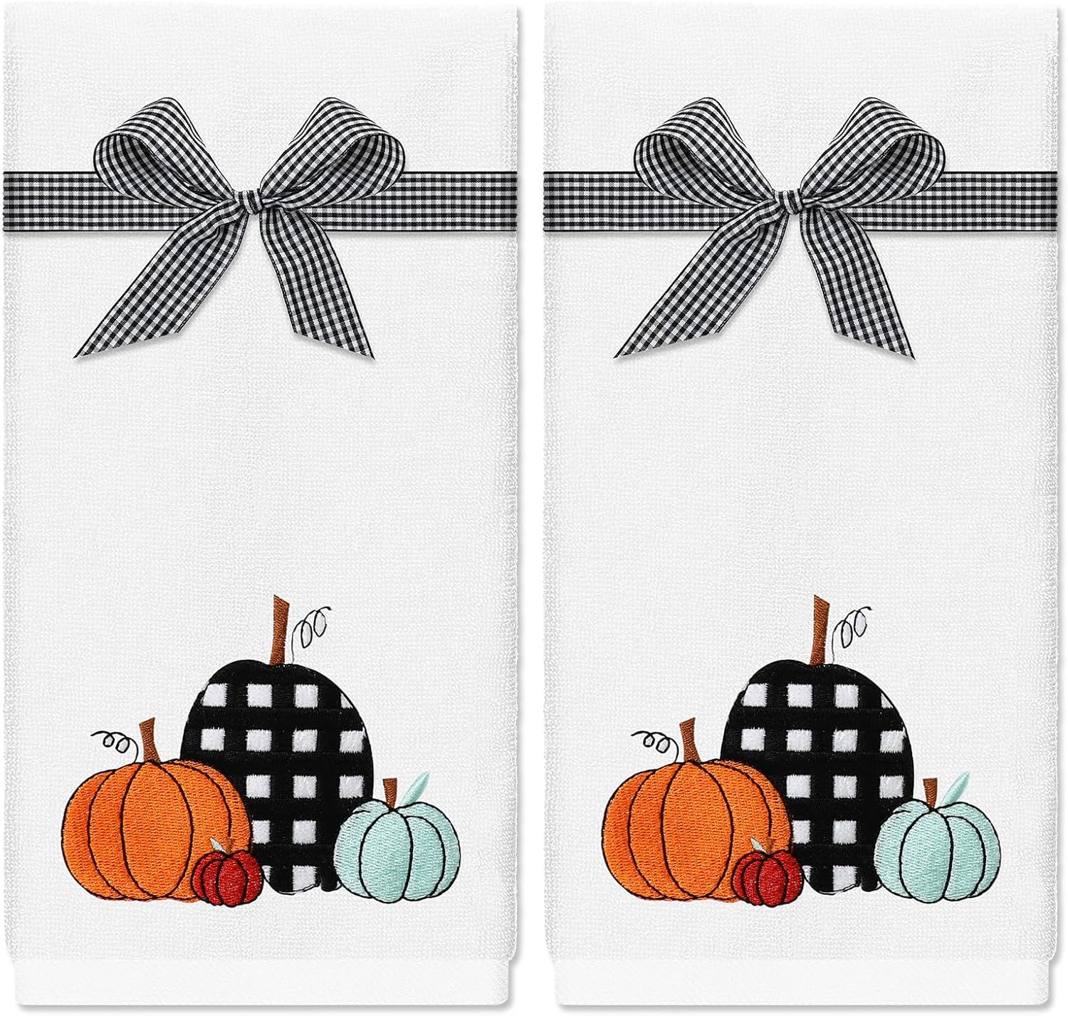 - WHAT YOU WILL GET: 2pcs fall hand towels with black and white plaids ribbon are contained in the set, with delicate design that makes them beautiful and practical accessories for cleaning and drying. Warm reminder: The ribbons we provided are not tied into a bow as the picture shows. You need to tie them yourself. Notice: The embroidered pattern is backed with a layer of plastic film, which can make the pattern look more delicate, will not affect your normal use, thanks for your understanding.