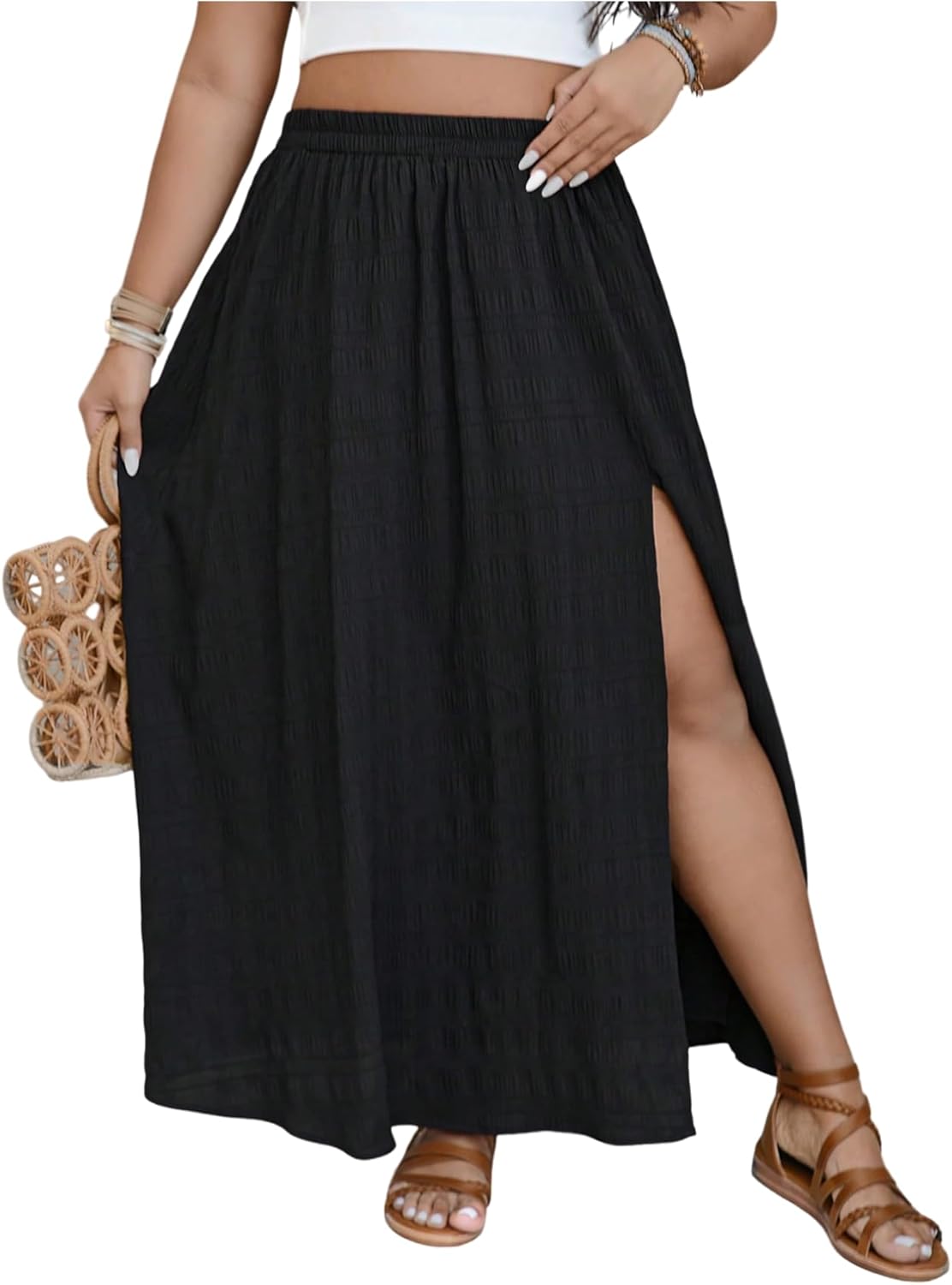 GORGLITTER Women's Plus Size Maxi Skirt Boho Summer Flowy Tiered A Line High Waisted Side Split Long Skirts with Slit