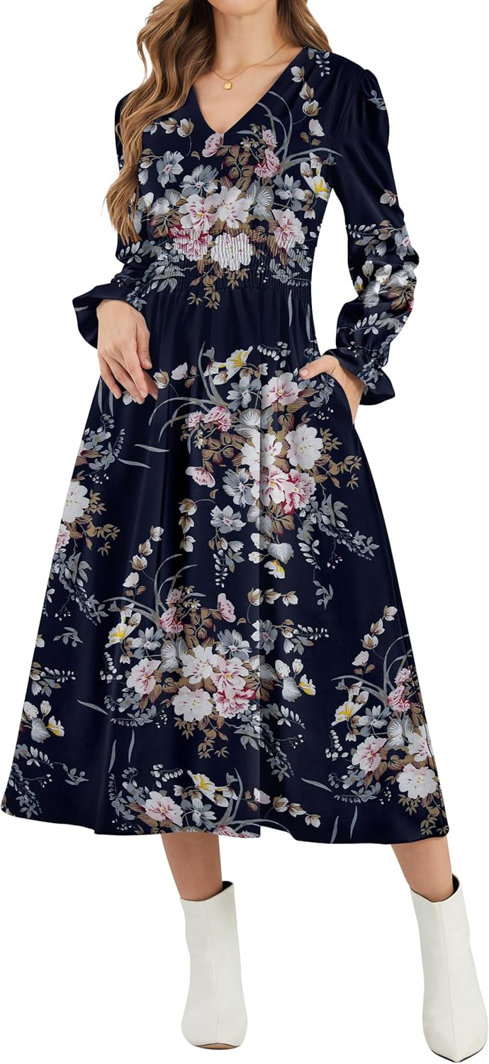 CYiNu Womens Floral Long Sleeve Midi Dress Deep V Neck Elastic Waist Boho Floral Dress for Women