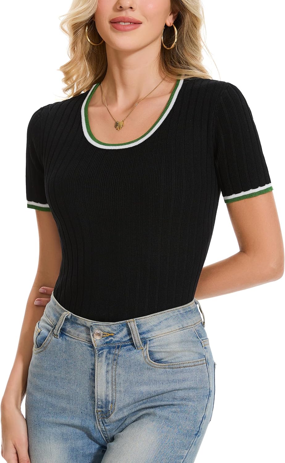 Women's Short Sleeve Scoop Neck Tshirts Color Block Slim Fit Ribbed Knit Summer Basic Casual Tee Tops