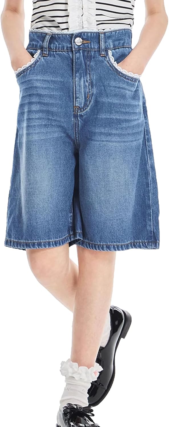 Tengo Girls High Waist Elastic Jean Shorts Bow-Tied Loose Wide-Leg Girl's Denim Shorts 5-14Y