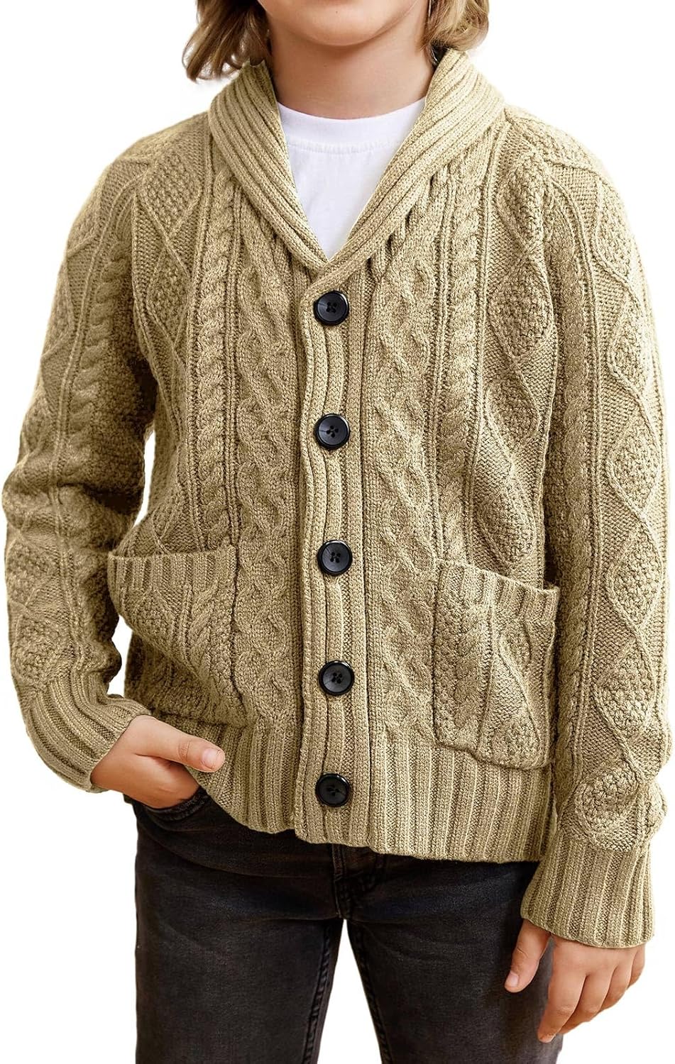 rrhss Boys Cable Knit Cardigan Sweater Kids Button Down Shawl Collar Outwear Sweater with Pockets 3-12 Years