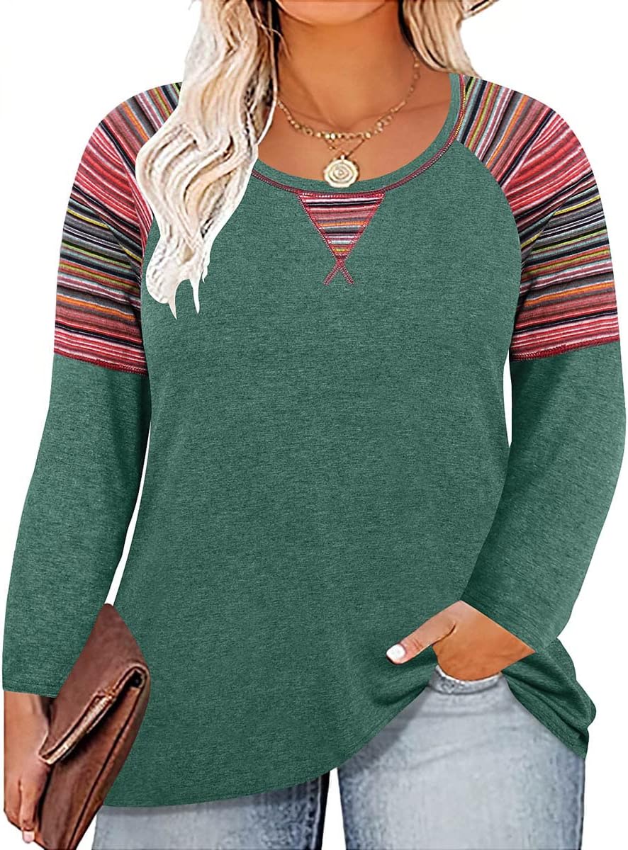 TIYOMI Plus Size T Shirt Tunic Tee Long Sleeved t Shirt Round Neck Raglan Color Block Tshirt Colorful Fall Autumn Winter Tee