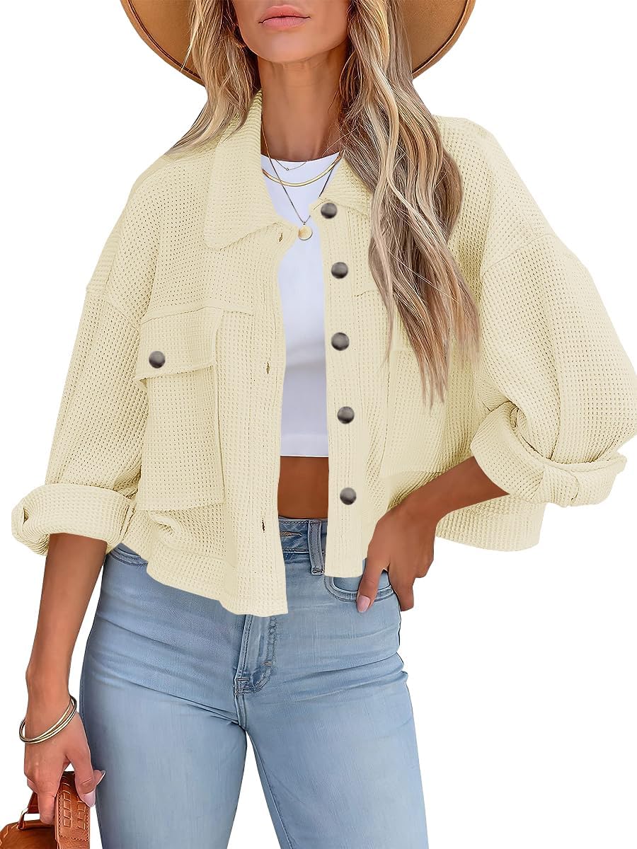 BZB Womens Waffle Knit Shacket Jackets Lightweight Cropped Shacket Long Sleeve Button Down Shirts