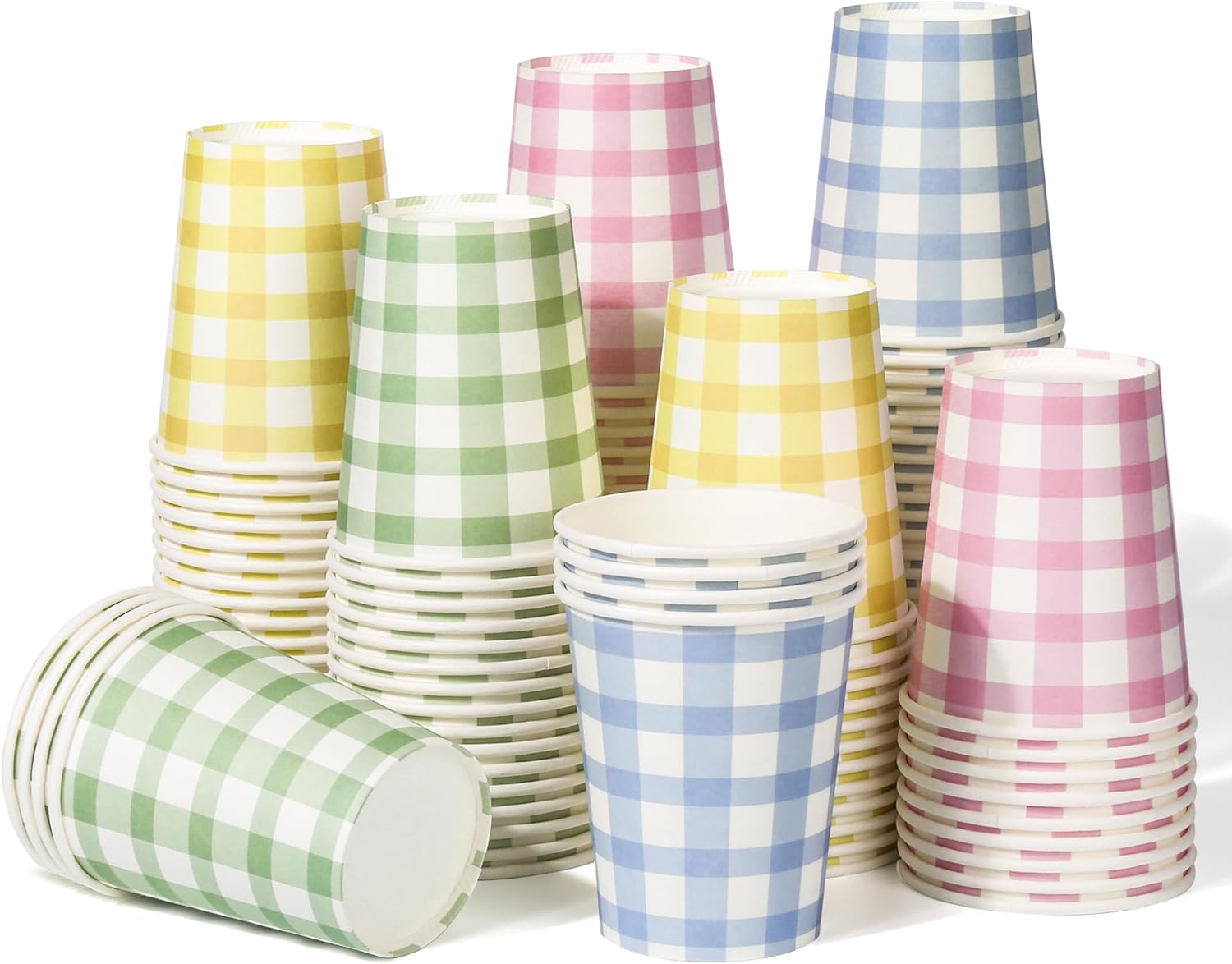 - Exquisite Plaid Design:Our 9 oz disposable paper cups come in gingham glaid pattern design with 4 bright of colors. Light blue, light green, light yellow and light pink colos scheme and enough quantity to match a variety of party themes, including girls' parties, baby shower, tea parties, birthday parties and more... fresh looking colors bring a strong summer and holiday party atmosphere, but also make your guests relax and enjoy the party time.