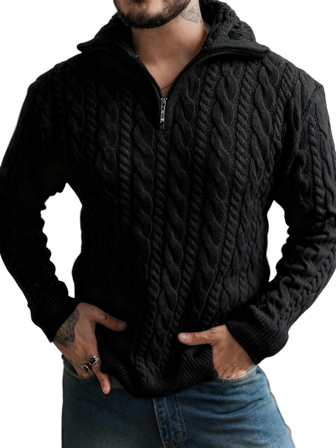 Yousify Mens Quarter-Zip Pullover Sweater Casual Mock Neck Cable Knitted Winter Warm Chunky Polo Sweaters