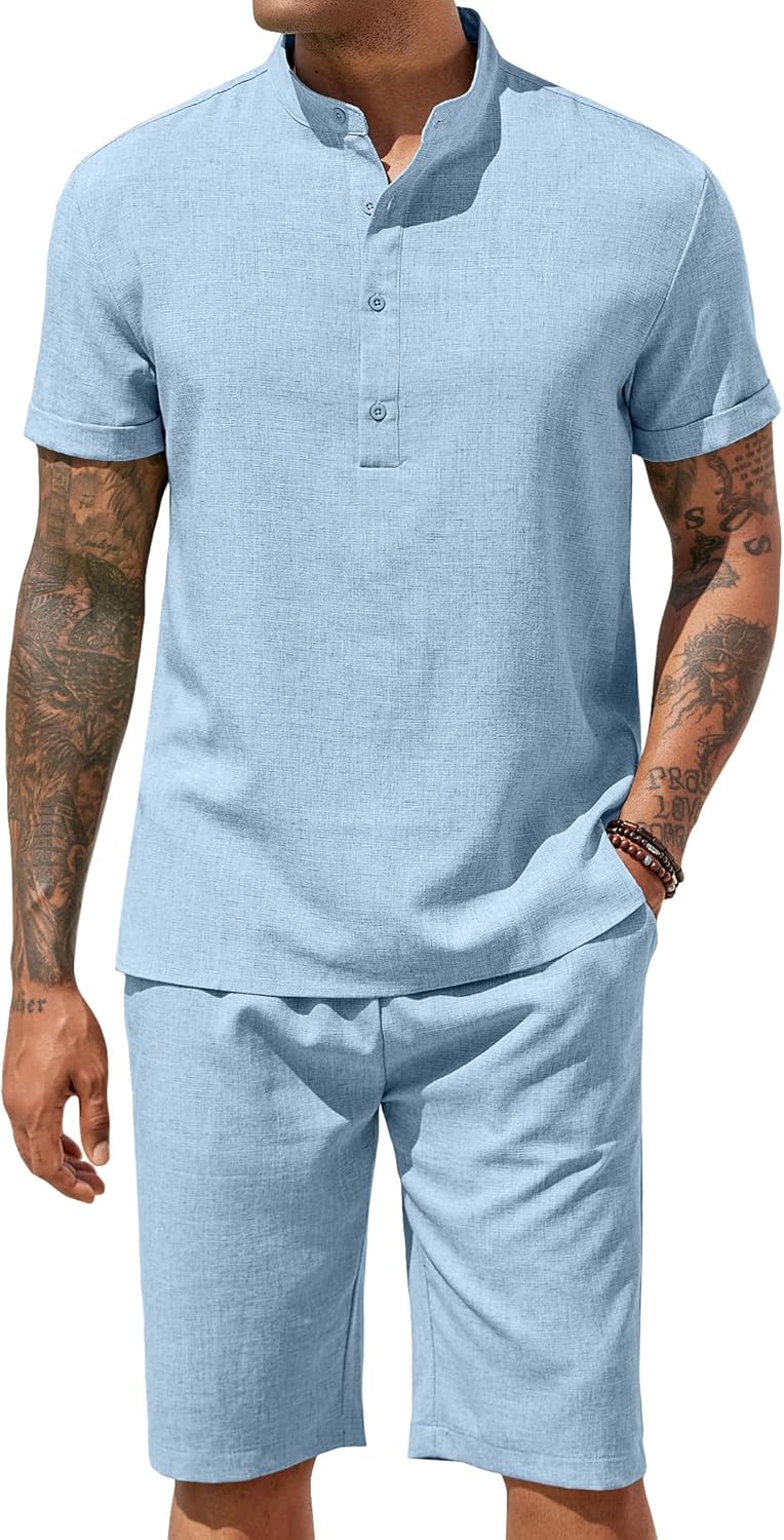 COOFANDY Men's 2 Pieces Set Short Sleeve Henley Shirts and Shorts Pants Texture Summer Beach Vacation Outfits