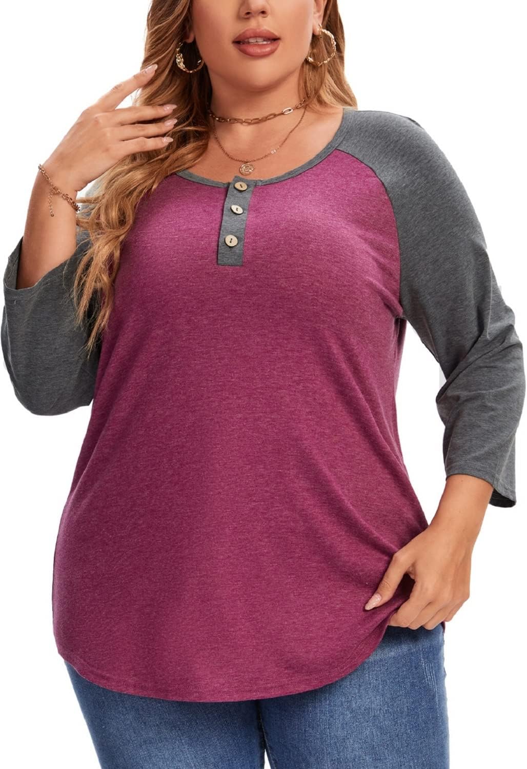 3/4 Sleeve Shirts for Women Plus Size Casual V Neck Blouses Color Block Henley Shirts