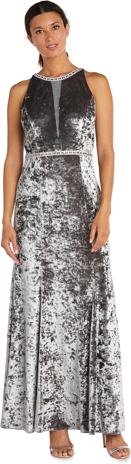 R&M Richards Women's Long Ice Velvet Dress W/Elegant Neck Waist Detail & Slit
