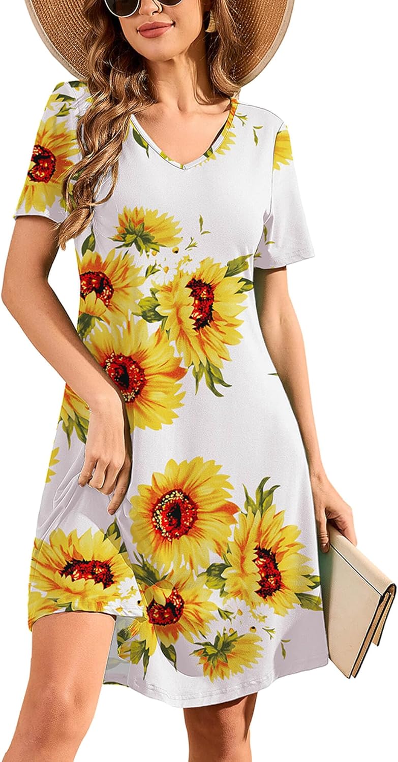 DEARCASE Women's T Shirt Dress Short Sleeve V-Neck Spring Summer Casual Loose Flowy Swing Midi Tunic Dresses