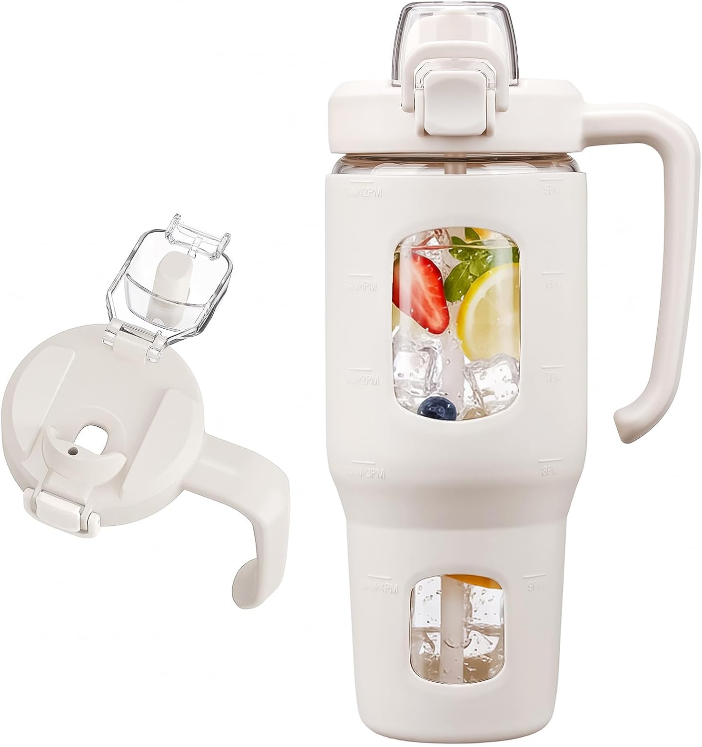 - 2-IN-1 LID: 32oz Glass tumbler features ergonomic handle and silicone sleeve boot for added protection and secure non-slip base. Crafted from thick borosilicate glass, it's ideal for home, office, or gym workout use. The glass cup enables two ways to drink water : sip and chug with convenient 2-in-1 lid, perfect for busy on the go.