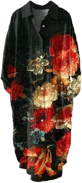Women Casual Boho Floral Print Linen Maxi Dress Long Sleeve Button Down Lapel Loose Beach Vacation Flowy Shirt Dress