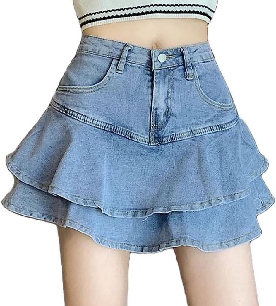 Women's Casual Denim Mini Skirt Ruffled Slim A-line Pleated Jean Short Skirt