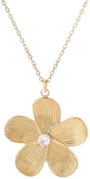 18K Gold Plated Flower Pendant Necklace – Statement Elegant Textured Petals with Cubic Zirconia Center