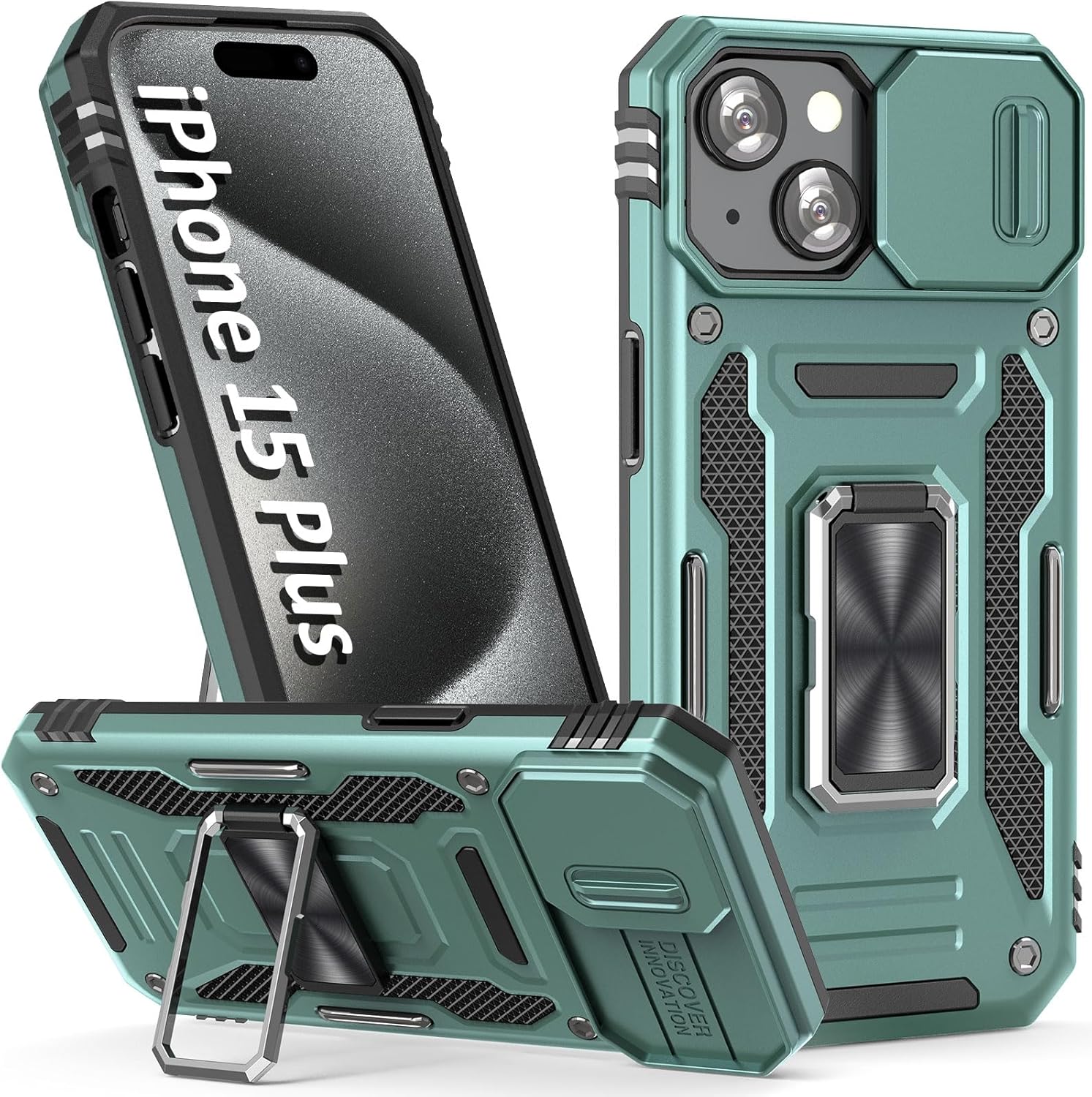 Phone Case for iPhone 15 Plus Case with Slide Camera Cover, with Finger Ring Holder Stand, fit Magnetic Car Mount, for iPhone 15 Plus (Alpine Green)