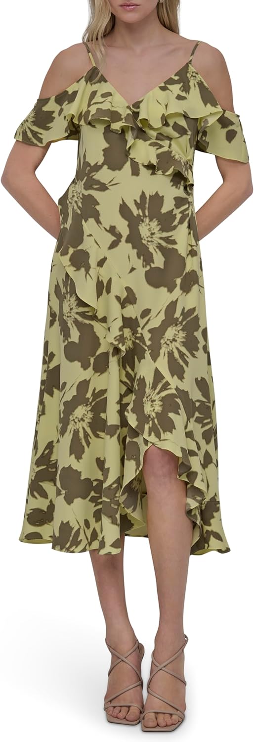 DKNY Womens Cold Shoulder Surplice Neck High Low Hem Ruffle Dress